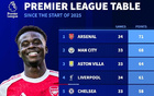 2025年英超积分排行:枪手71分居首,曼城68分第二,维拉第三