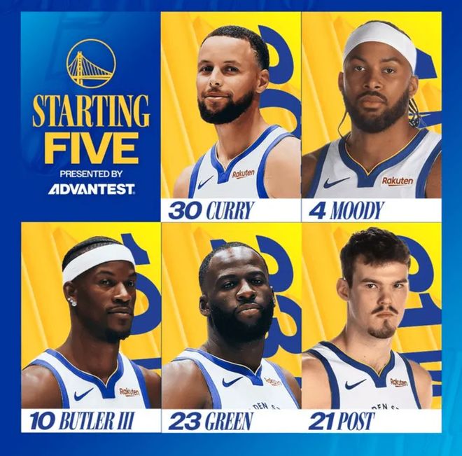 首发阵容方面,太阳队这边,教练排出的首发五人组为:吉莱斯皮、布克、狄龙-布鲁克斯、奥尼尔、马克-威廉姆斯;勇士队这边,首发阵容则为:斯蒂芬-库里、摩西-穆迪、吉米-巴特勒 、德雷蒙德-格林、昆滕-波斯特。